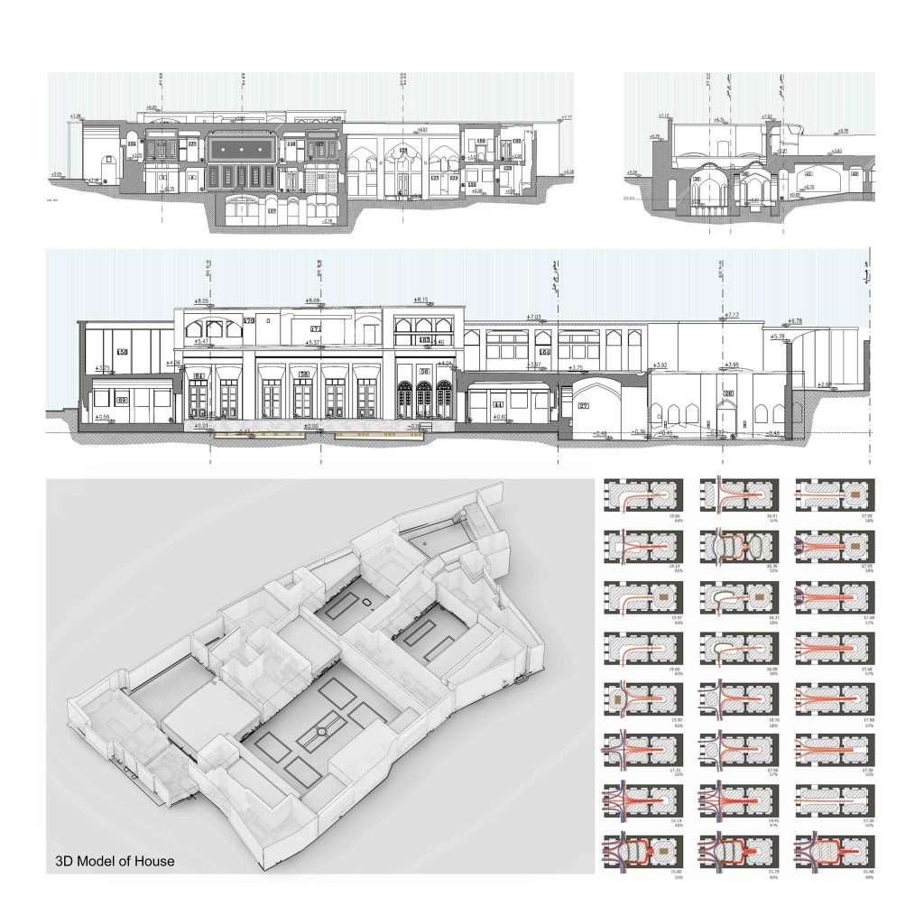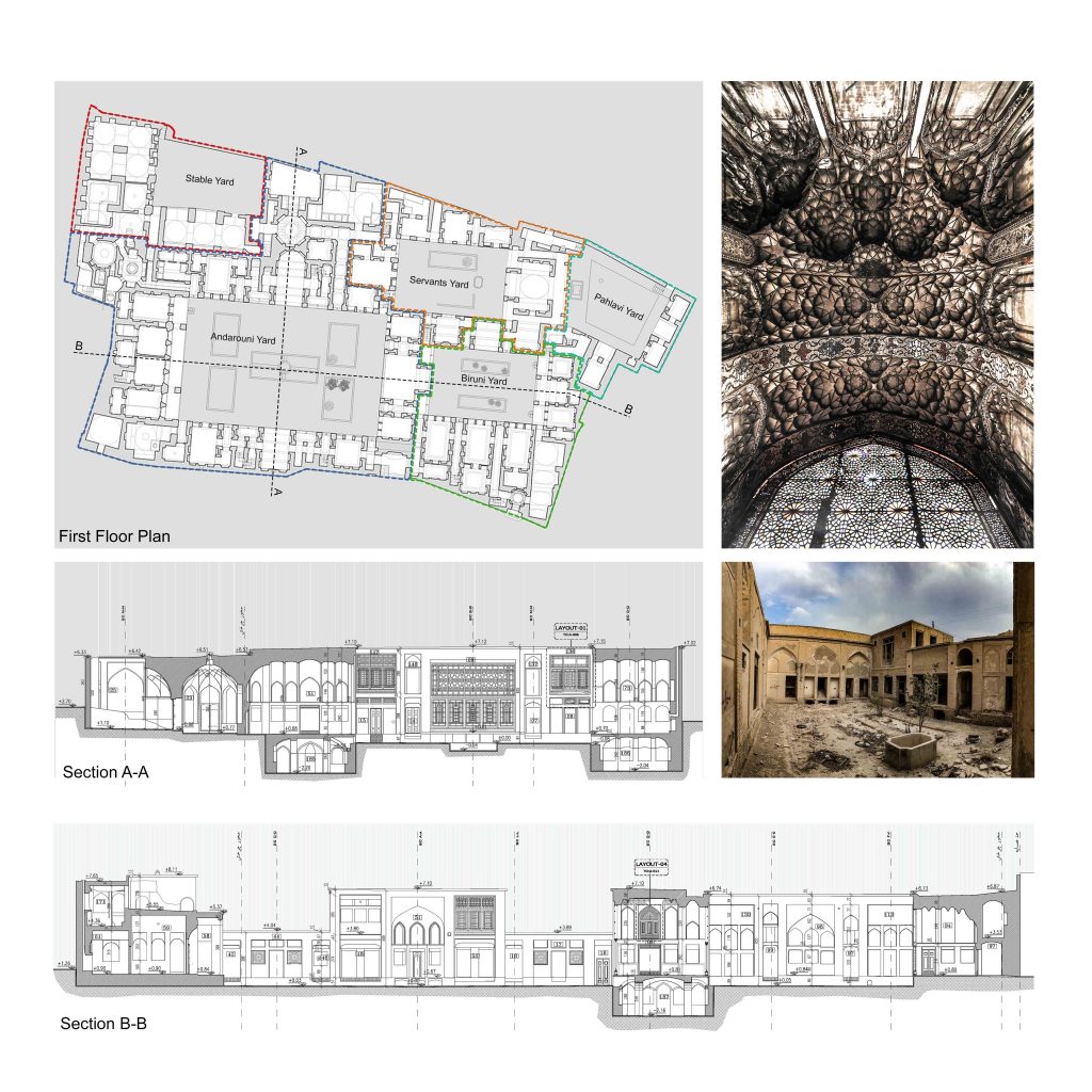 The house has 4 courtyards; Andarouni (family yards), Biruni (Commercial yard), crew, stables, and more than 50 rooms, which were built in Iranian traditional house styles.